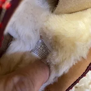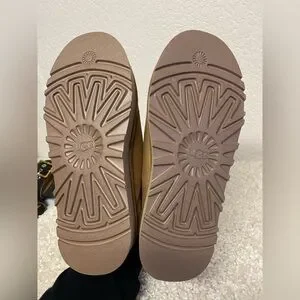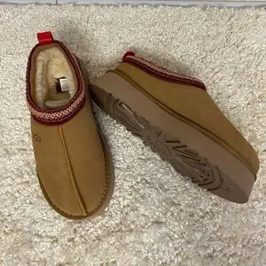 Chic UGG flats platform with cozy lining. Features red trim. Ideal for casual outings.