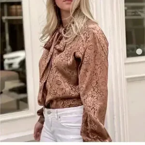 Floral lace print, silk jacquard blouse, ruffled front, buttons down, buttons have GG -Gucci logo.