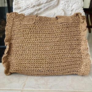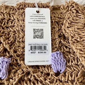NWT Urban Expressions “calliope” tote/ handbag woven with straw, featuring colorful woven accents in lavender light tan and light green. It has double handles, a magnetic closure, ruffled edges, and is lined in smooth tan cotton with 2 slip pouches and a zipped pocket. Perfect bag for any activity; gives off a beachy hobo vibe.