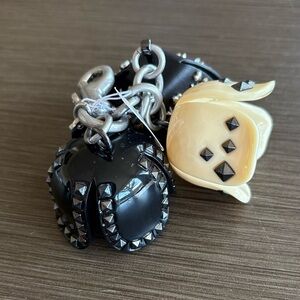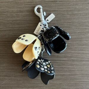 NWT 2017 Coach Studded Tea Rose charm in black and cream featuring three resin and leather blooms with mixed metal studs in brass, silver, and gunmetal. Matte silver dog-leash clip.