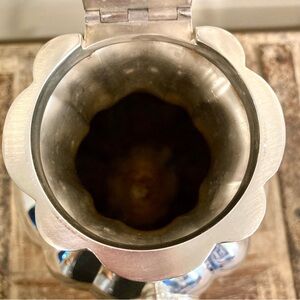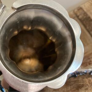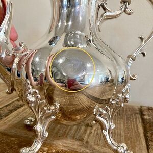 Condition: Poor used condition. There are large dents on both front and back sides of this teapot (see final 2 photos for a closeup). The interior has lots of buildup that looks like years of coffee residues. There are many scratches and areas of tarnish.