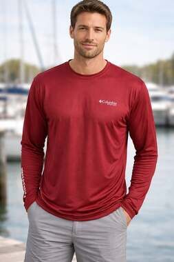 Columbia Men's PFG Terminal Tackle Statetriot Alabama Flag Long Sleeve Shirt in Red, Size Large. This performance fishing shirt features a unique Alabama state silhouette on the back filled with a fish-patterned American flag design.