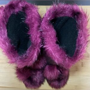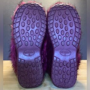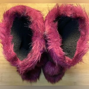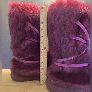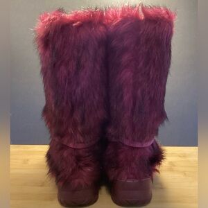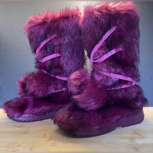 Colin Stuart deep burgundy/ black streaked Eskimo fur boots with pink suede ties and pom-poms. Size is 6. Y2K- era. They appeared in the Victoria’s Secret catalog around 2008- 2010 worn by their models. Great condition. Preowned.