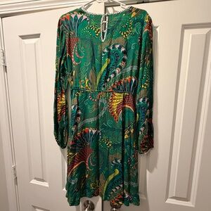 The Maeve Janis Anthropologie Green Printed Long Sleeves Dress in size 6 is a stylish and versatile piece perfect for a variety of occasions. This knee-length A-line dress features a beautiful floral pattern in green, with long balloon sleeves and a scoop neckline. Made from viscose jersey fabric, it offers a comfortable fit with a tie closure and drawstring waist detail. The dress is designed with classy accents like buttons at the shoulders and is ideal for casual wear during the summer, fall, and spring seasons.