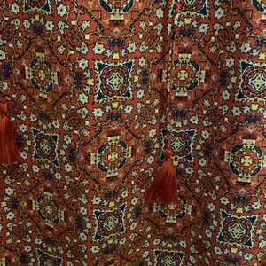 Keywords: Bohemian, Festival, Plus Size, Tassel, Medallion, Sharkbite Hem, Summer, Lightweight, Ethnic Print, Peasant Top, Warm Tones, Casual, Flowy