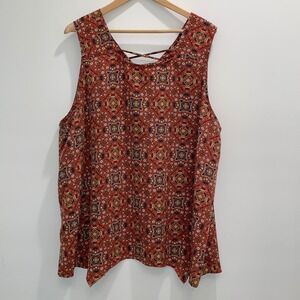 Lightweight sleeveless blouse showcases a vibrant geometric medallion print in warm earth tones. Designed with a relaxed fit, this top features a bohemian-inspired lace-up neckline accented by delicate tassels and a stylish crisscross detail at the back. The sharkbite hem adds a modern, asymmetrical touch to the silhouette, making it an ideal choice for layering or wearing on its own during warmer months.