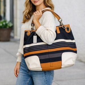 Coach Stripe Canvas Leather Trim Tote Bag Satchel Shoulder Bag Large Academia