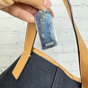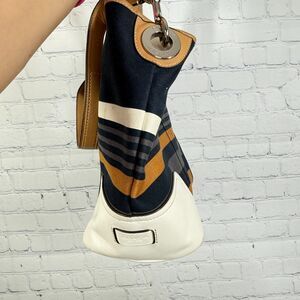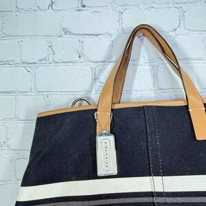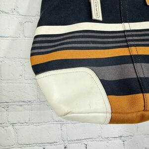 Coach Stripe Canvas Leather Trim Tote Bag Satchel Shoulder Bag Large Navy Tan White