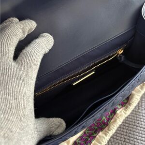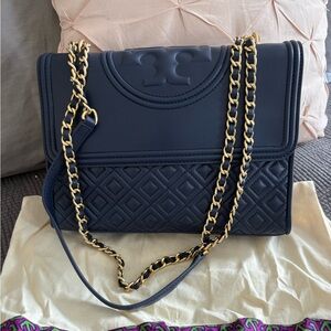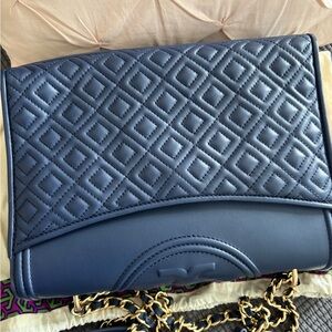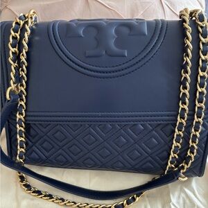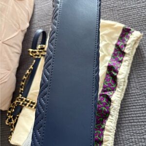 Navy quilted shoulder bag with gold chain strap. Features Tory Burch logo detail. Stylish and versatile. Like New!