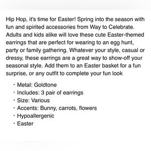 Celebrate spring in the sweetest way with this adorable 3-pair Easter stud earring set featuring a delicate daisy flower, pearl bunny silhouette, and sparkling carrot design. These goldtone hypoallergenic earrings are perfect for Easter outfits, spring fashion, egg hunts, brunch, seasonal parties, or everyday whimsical style.