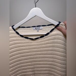 Neckline: Crew neckline with dark blue ribbed trim for a polished and subtle accent.