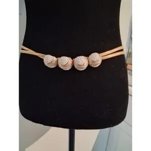 Judith Leiber vintage stretch belt showcases a sophisticated gold-tone double snake chain design. The focal point features four ornate spherical baubles meticulously detailed with faux pearls and sparkling pavé crystals. This elegant accessory offers a flexible fit, making it a versatile addition to formal or evening attire. The craftsmanship reflects the luxury aesthetic synonymous with the Judith Leiber brand, with the signature hallmark visible on the interior of the clasp.