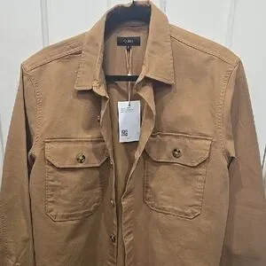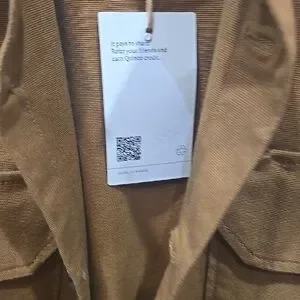 Elegant camel jacket with button-up design. Features a sleek collar.