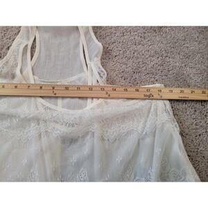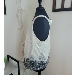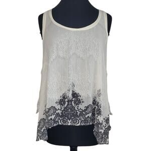 Mudd women’s ivory sheer lace overlay tunic with black lace print hem. Racerback sleeveless, one-piece design. XL. EUC.