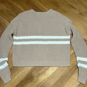 Stylish tan sweater featuring white stripes. Ideal for casual wear.