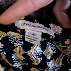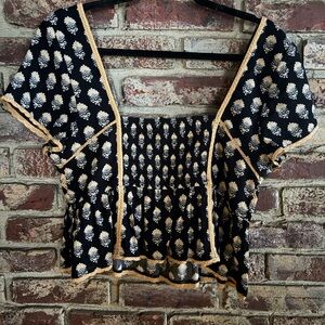 Super cute boho-inspired American Eagle blouse featuring a flattering square neckline, smocked bodice, and flowy peplum hem. The black fabric with cream/tan floral block print gives major cottagecore + vintage vibes. Lightweight and breathable — perfect for spring, summer, or layering with a cardigan.