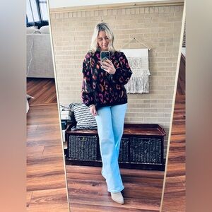 Bold leopard print sweater with vibrant colors. Perfect for a stylish look.