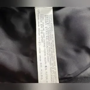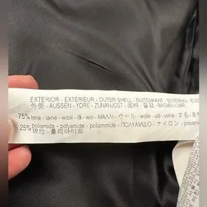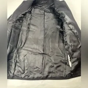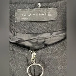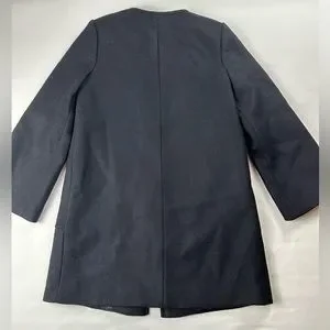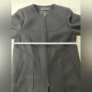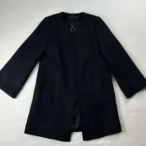 Black zip up 75% wool coat with pockets. Zipper stops for open bottom.