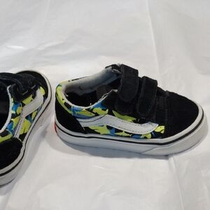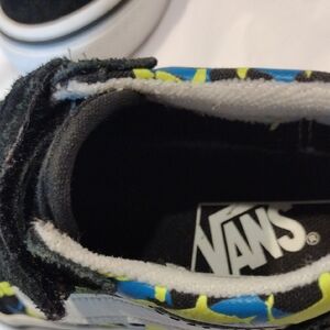 Vans, Stylish and comfortable kids sneakers with easy Velcro straps. easy on and off, Fun design with yellow and black stripes on the sides. size 7, used in good condition, much loved still plenty of life left. Perfect for everyday wear. smoke free home and pet-free home.
