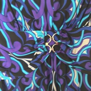 This dress has a print in black ,purple ,grey, blue and turquoise It is made in a great traveling fabric that won’t wrinkle. A very slimming style in size 18