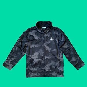 Boys Adidas Camo Print long sleeves zipper front track jacket. Has the classic 3 stripes in black down the sleeves. Colors best represented by close up photo of print. 100% polyester. Style Number: AG6202-A