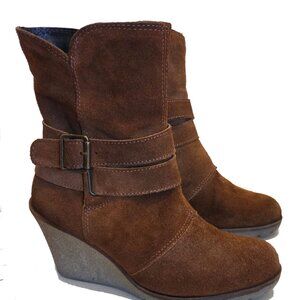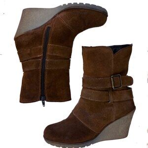 Brown suede wedge ankle boots with a chic, modern silhouette. These boots feature a comfortable wedge heel for added height and stability, dual strap buckle detail for an edgy touch, and a convenient inner side zipper for easy on and off. The textured sole provides good traction, making them practical as well as stylish.