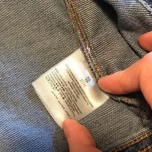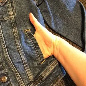 Medium wash denim jacket. Two front pockets that can fit a smaller iPhone. The sleeves can roll up. This jacket looks great over casual dresses or t-shirts and is still in great shape, it’s just a little too small for me now!