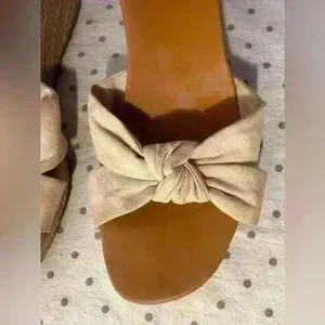 Back zip, slight platform, espradille sandals by UGG. Light pink to almost cream canvas upper. Leather insole. Wrapped base. Bow is tied but can be adjusted. Fun shows that add a little flair to your outfit.