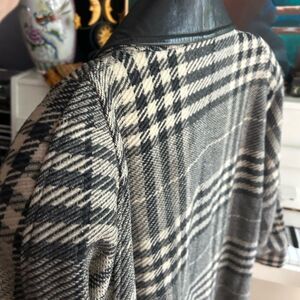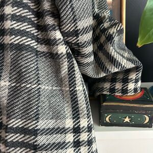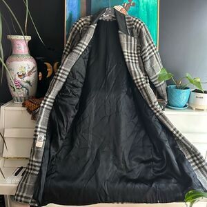 Elevate your style with this chic plaid trench coat. Featuring a classic black and white design, it's perfect for any occasion. Stay warm and fashionable. Some small stains all over. A tear in pocket lining. Can easily be washed and fixed. See pics for wear.