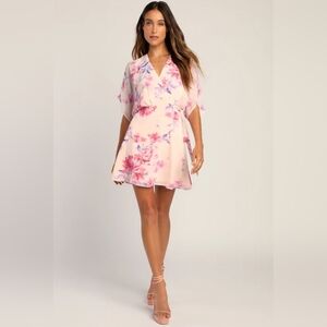 Lulus Lovely Aura Blush Pink Floral Short Sleeve Wrap Dress M