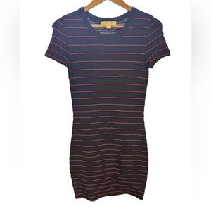 Above the knee, short sleeves, form fitting dress from Michael Michael Kors. Navy blue & Red with white ruffled stripes. This dress would look great with sneakers or heels.