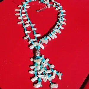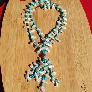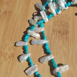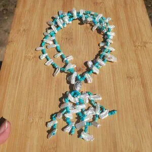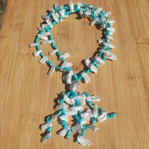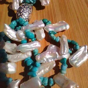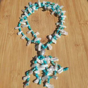 Absolutely stunning necklace the color of the high quality turquoise is sky blue, the real freshwater keshi pearl have great luster, the necklace is a must have for any jewelry lover, the best of land and sea is combined in this necklace,