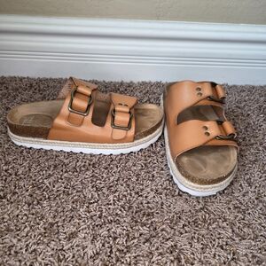 These are slip-on sandals that feature a double buckle design with an open toe.