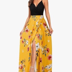 Elegant maxi dress featuring a vibrant floral design. The dress combines a striking yellow skirt with a classic black top, perfect for any occasion.