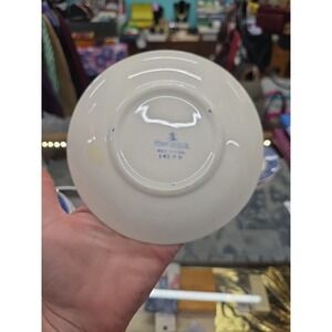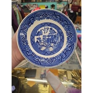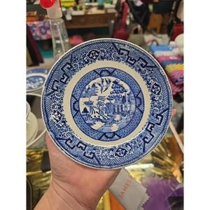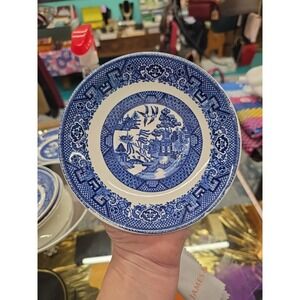 The product is a vintage Homer Laughlin Blue Willow replacement saucer plate , featuring a classic blue and white ceramic design. Made in America as part of the Willow Blue product line, these 5 3/4" saucer plate are perfect for serving coffee or tea on any occasion. With a timeless Blue Willow pattern and the quality craftsmanship associated with Homer Laughlin, these plates are a stylish and practical addition to any table setting.