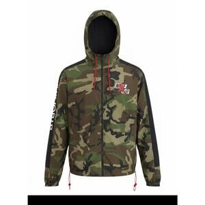 SEOUL, South Korea Exclusive....Nike Air Jordan hooded windbreaker jacket in camouflage pattern with black accents. Features full front zipper, adjustable hood with red drawstrings, and elastic cuffs. Lightweight and perfect for casual wear or outdoor activities. Authentic with original tags attached. (South Korea: Size XL / US: Size Medium)
