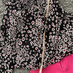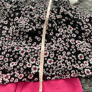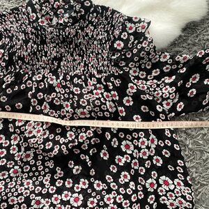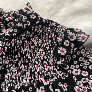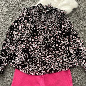 This blouse is a stylish and versatile piece that can be dressed up or down. It features a delicate floral print, a high neck, and long sleeves. The smocked bodice adds a touch of femininity, while the ruffled trim adds a touch of whimsy.