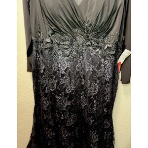 This stunning black Mac Duggal dress features a wrap-over bodice with lace applique and a trumpet style. The long sleeve dress has a V-neckline and a zipper closure, making it perfect for formal occasions, weddings, or even a holy communion. The dress is made of polyester with a jersey fabric type and is available in a size 16W. No returns for sizing. Please see size chart. Black tie elegant