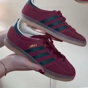 Classic Adidas Gazelle in burgundy suede. Dark green stripes add contrast. Comfortable and stylish for everyday wear.