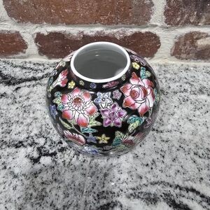 This item is a vintage Chinese porcelain ginger jar, often decorated in the Famille Noire style, which features intricate hand-painted floral designs against a black background.