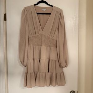 Gianni Bini Talia Beige Long Sleeve Smocked Waist Tiered Hem Dress