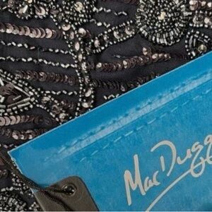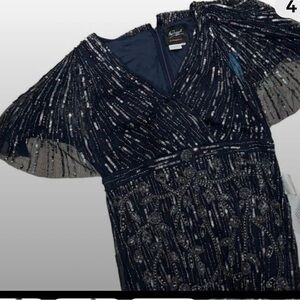 Chic midnight blue dress with exquisite bead detailing. Features a stylish V-neck and elegant fringe sleeves.