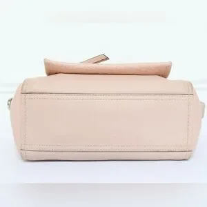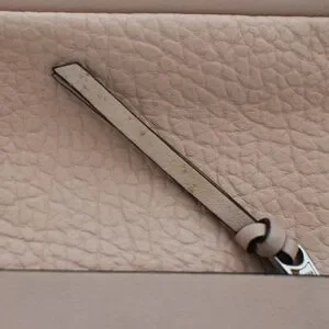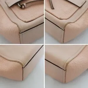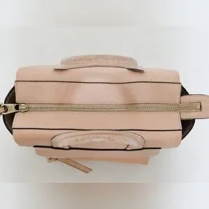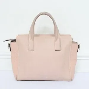 Light pink pebbled leather, mini, top handles, zip top, stamped hardware, exterior zip pocket, lined, interior pockets