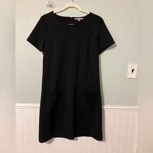 A cute, structured work dress. Short sleeved. Front pockets. Poly/cotton/rayon blend. Very flattering.