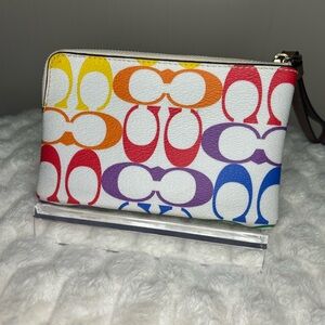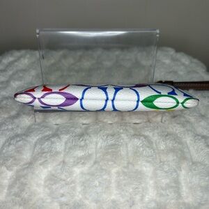 Coach wristlet with vibrant signature pattern. Includes a handy strap.