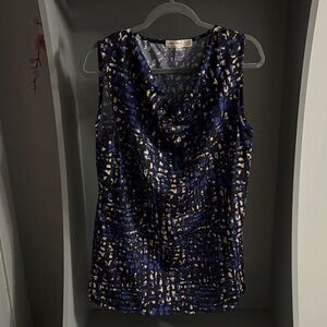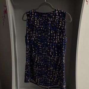 Chic sleeveless blouse with a striking blue and black pattern. Perfect for versatile styling.