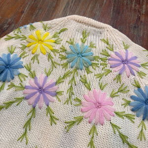 Cream sweater with pastel pink, blue, purple, yellow and green floral detailing