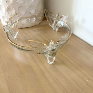 Elegant glass dish with butterfly design. Features gold accents. Perfect for decor or serving.