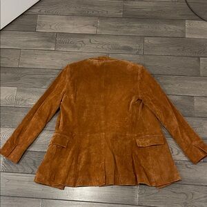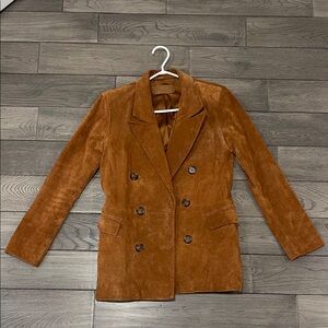 100% genuine suede leather. Worn only once. Stylish tan blazer with a double-breasted design. Features a classic fit and elegant look.