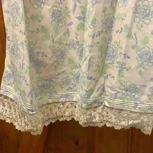 Eileen West sleeveless cotton nightgown. Lightweight and comfortable. It features a floral pattern with a blue, white and green color palette other features include a sweetheart neckline, pin tucking, Akoya shell button placket, and netting lace at the hemline & Hem. Nightgown length is approximately 50 inches. New with tags. 1683 x2 (Inventory #)